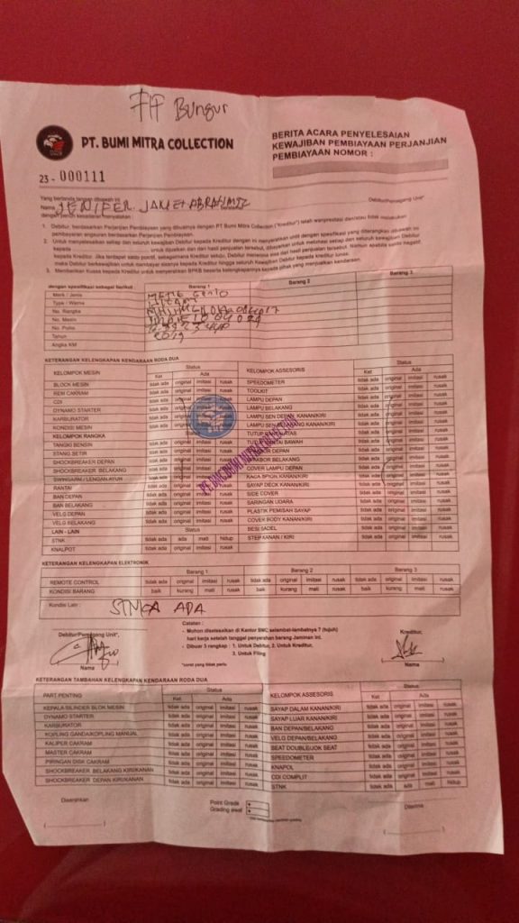Adapun Surat BERITA ACARA PENYELESAIAN KEWAJIBAN PEMBIAYAAN PERJANJIAN PEMBIAYAAN dengan NOMOR KOSONG dikeluarkan oleh PT. Bumi Mitra Collection dengan Nomor Surat 23- 000111 dan minta dengan paksa agar wartawati kantorberita.co.id menandatangani Surat tersebut, sebagai bukti penyitaan unit sepeda motor.