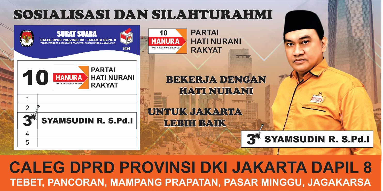 Kali ini ,Calon legislatif (Caleg) DPRD dari daerah pemilihan Dapil 8 Jakarta Selatan ( Kec. : Tebet, Pancoran, Mampang Prapatan, Pasar Minggu dan Jagakarsa) Syamsudin R, S.Pd.I dari Partai Hanura blusukan ke warga Masyarakat Dapil DKI 8 di Jl. Kp.Melayu Kecil RT.02, RW.10, Kel. Bukit Duri, Kec. Tebet, Jakarta Selatan.