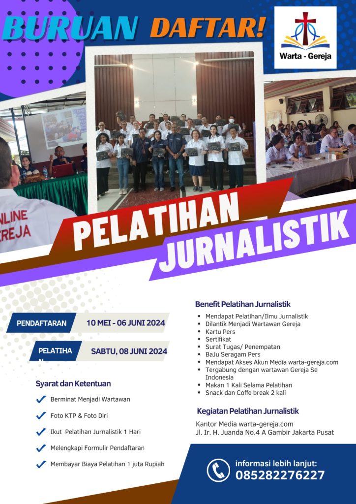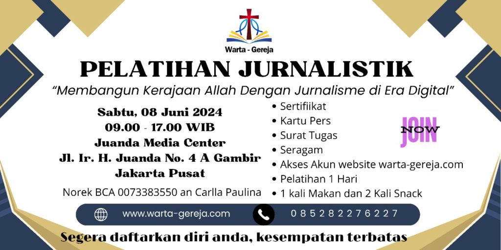 Kanalbhayangkara.com – Jakarta, Mengemban misi “Membangun Kerajaan Allah Dengan Jurnalisme di Era Digital”, Media Warta-gereja.com kembali menyelenggarakan PELATIHAN JURNALISTIK yang akan digelar pada Hari Sabtu, 08 Juni 2024 di Kantornya Lantai III Jl. Ir. H. Juanda No. 4 A Gambir Jakarta Pusat.