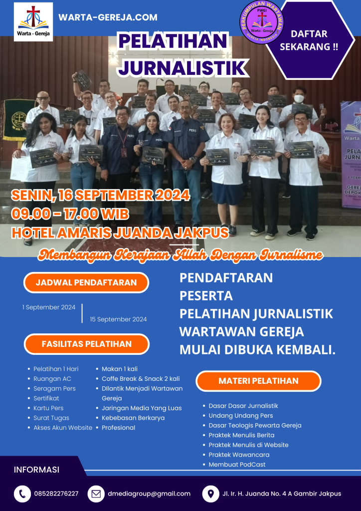 “Saya berharap, Para Pemuka Gereja, Organisasi Kristen dan Aktifis Kristen terpanggil bergabung Bersama kami. Dan dalam waktu dekat ini, hari Senin, 16 September 2024, Perkumpulan Wartawan Gereja Indonesia (PWGI) bersama Media Online Warta-gereja.com akan kembali menyelenggarakan PELATIHAN JURNALISTIK. Kami membuka kesempatan bagi warga gereja yang berminat menjadi WARTAWAN GEREJA dapat ambil bagian di dalamnya.” Pungkasnya.