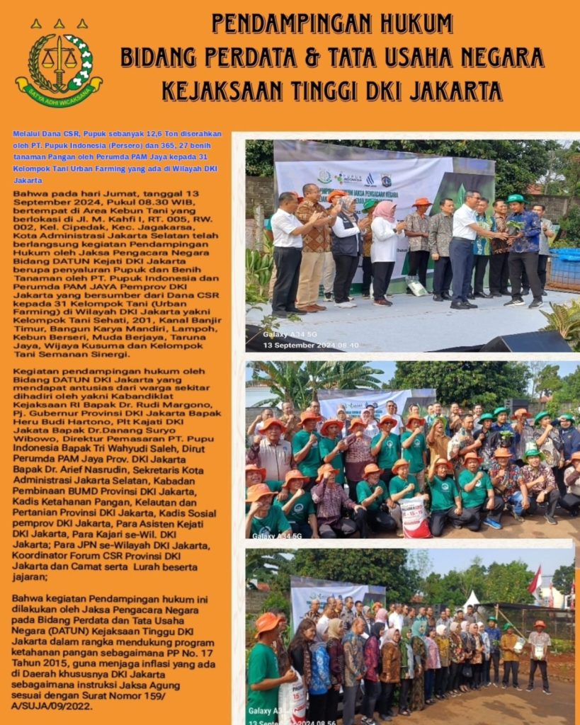 Instansi-instansi itu menyerahkan bantuan pupuk dan benih kepada 31 Kelompok Tani di Wilayah Daerah Khusus Jakarta. Penyerahannya dilakukan langsung oleh Kejati Daerah Khusus Jakarta di Kebun Berseri Jl. Cakra Negara Raya Komplek Bukit Mas Kelurahan Bintaro Kecamatan Pesanggrahan Kota Jakarta Selatan, pada Jumat, 13 September 2024.