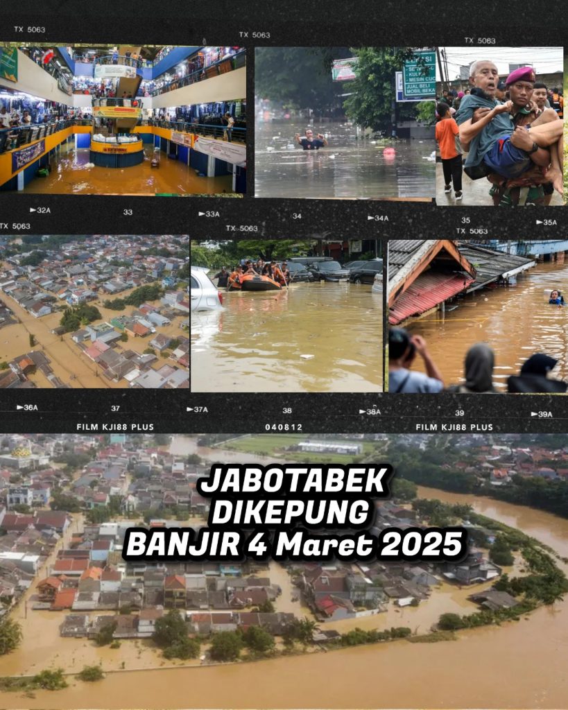 Kanalbhayangkara.com – Jakarta, Bekasi, Tangerang Selatan – Banjir besar melanda wilayah Jabodetabek pada Senin (3/3) malam hingga Selasa (4/3), menyebabkan kelumpuhan di sejumlah wilayah, terutama Kota Bekasi. Banjir kali ini disebut sebagai yang terparah sejak banjir besar 1 Januari 2020, bahkan melebihi ketinggian air saat itu. Ribuan rumah dan sejumlah fasilitas publik terendam, memaksa ribuan warga mengungsi.